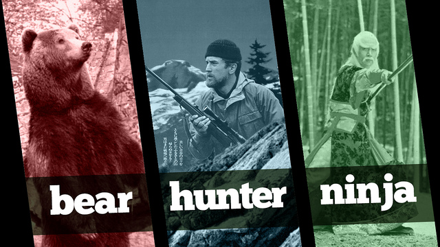 Sometimes, especially midweek, I’ve found that I have to up the ante. For example, on the way home from school I told Big Cat and Mr. Man that they had to get all of their chores and homework done “super fast and super right” because I was dying to show them a little game I like to call Bear/Hunter/Ninja…because that’s what the game is called. (It is worth noting that when I told them they better “burn through their lists because Bear/Hunter/Ninja is awesome,” Big Cat requested some matches.) Immediately intrigued, both boys raced to finish their chores and met me outside.