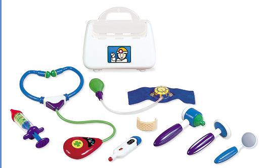 Back when Doc was 3 years old he gave me a checkup with his toy doctor bag, complete with stethoscope, blood pressure gauge, reflex hammer, measuring tape(think he may have mixed kits with that one), and syringe. After repeating all methods of procedure approximately seven times, he delivered my diagnosis stating that, “You have good blood pressure. And good reflexes. And you are a 10.” There you have it, good vitals and measurements a perfect ten! With my health in order, I helped playing doctor become more of a well-rounded game for Doc. We brought down stuffed animals from upstairs and made one chair the waiting room, we even put magazines and books in the chair so the patients would have plenty to read while they waited. In front of the fireplace, we had the examination room set up, where Doc was chief resident cutie in charge! And on the sofa we had a treatment area set up, where patients who had suffered through their shots could put their feet up and relax until their folks could pick them up (obviously Doc’s chosen field at this point was pediatrics). So proceeded an afternoon of Dr. Doc bringing joy and care to his ill playthings…and his Miss Cheryl. ☺
