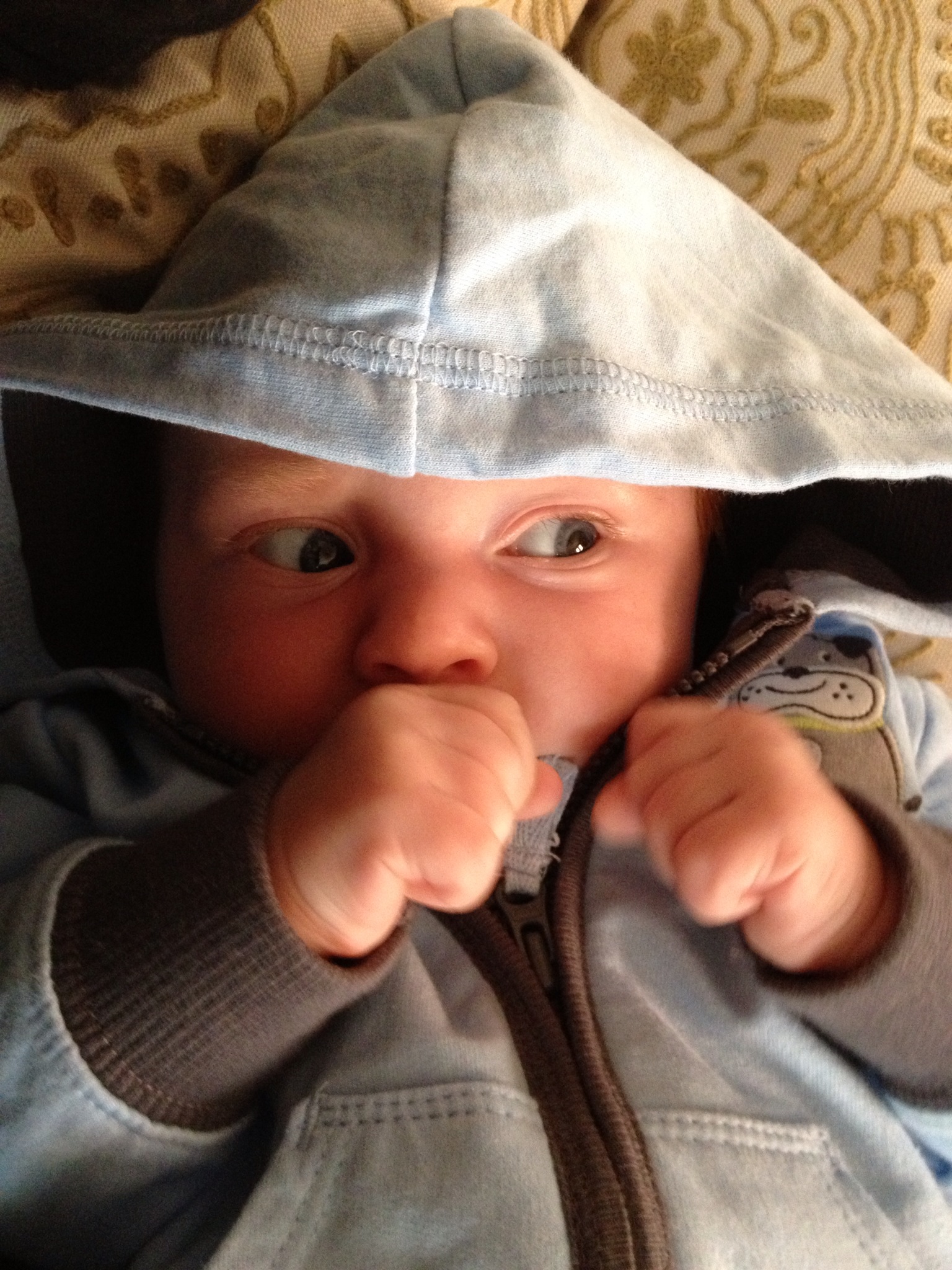 El Fuego’s code name references, too, his increased body temperature. The child perspires 24/7! It’s as if he’s engaging in an extreme sport at all times! He is one hot little tamale! Even when it’s cold outside, he works up a sweat. Always on the go, even in his Ergo!