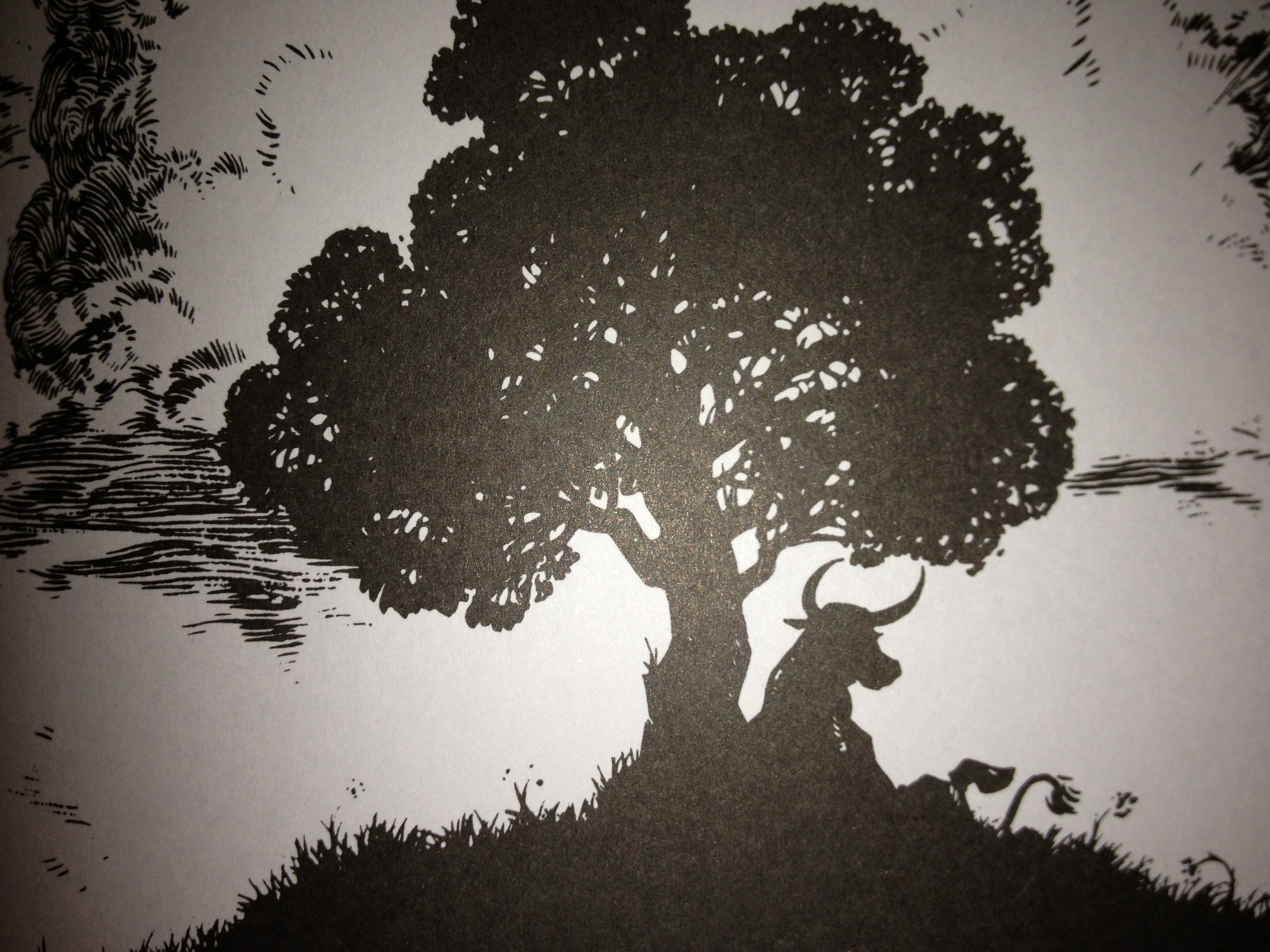 Our hero’s journey ends with Ferdinand being returned to his hillside home, and the author leaves him sitting under his beloved cork tree, last lines of the book reading,