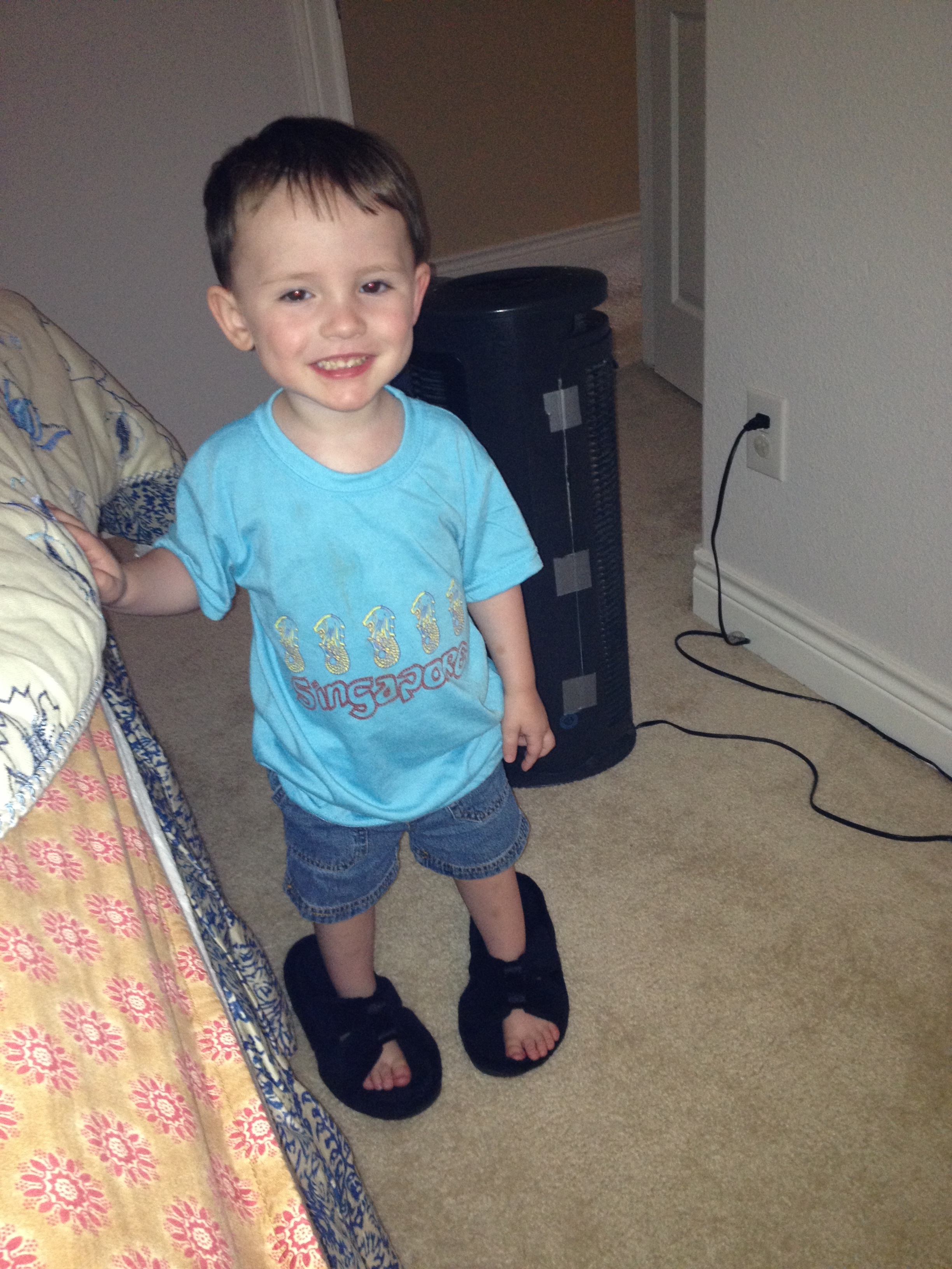 Hard to tell who is more excited about my new slippers: me or Rebel? Such a sympathetic kiddo, he wants to walk a mile in his nanny’s shoes. 😉