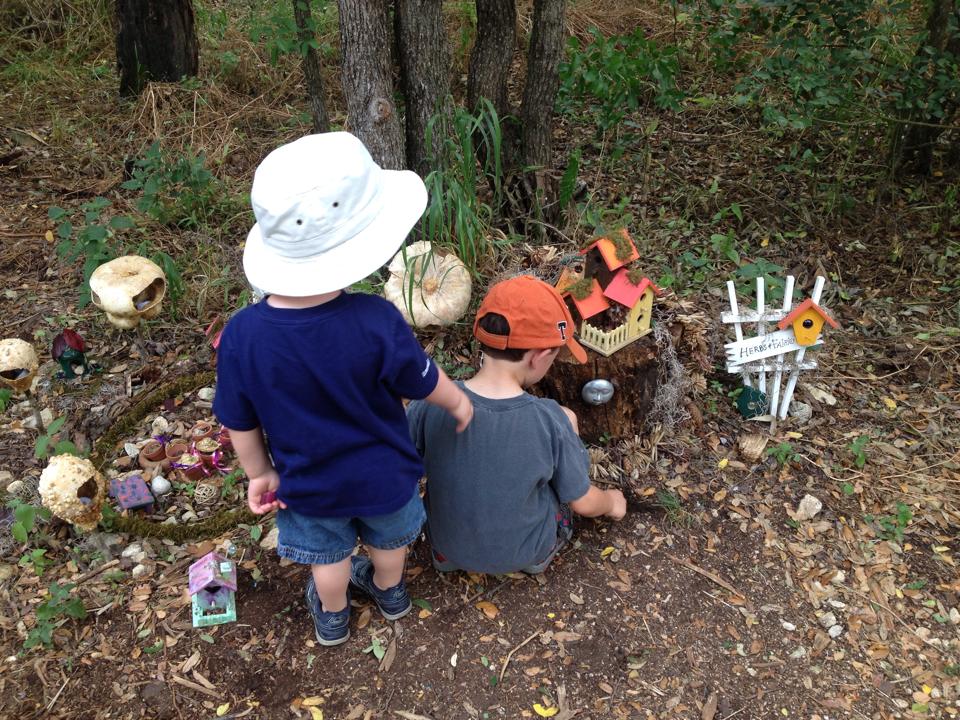 After picking up Doc from school and telling him about our amazing day, he immediately wanted in on this spritely action. And so the three of us ventured back to Faerieland, and spent the morning exploring. This was a fun and rare opportunity for Rebel to explain things to his older brother, and since he had already discovered the hidden houses, he was in a position to help Doc find them all.